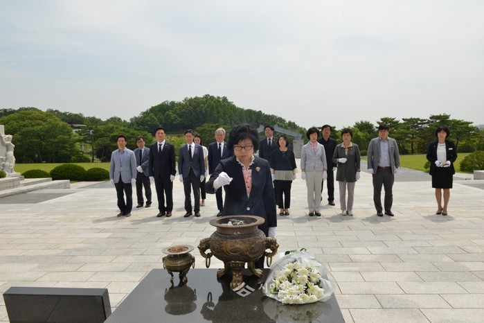 지난 21일 서울 강남구의회 복지도시위원회는 강북구에 있는 국립 4·19민주묘지를 참배하고 민주주의를 지키기 위해 희생된 순국선열들의 숭고한 희생정신과 넋을 기렸다. 사진은 복지도시위원회 위원들이 참배하고 있는 모습.(사진제공=강남구의회)