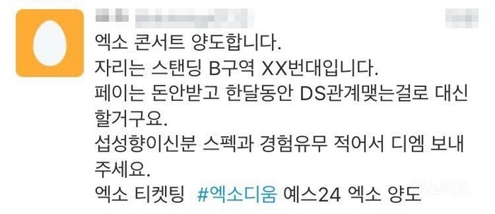 최근 SNS 중 하나인 '트위터'에서는 "엑소 콘서트 양도합니다"라는 글이 올라왔다. 충격적인 것은 뒤에 이어지는 내용이었다.