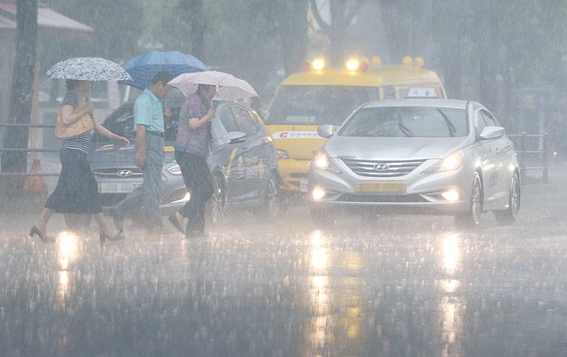 22일 오후 서울지역 장마전선의 영향으로 갑작스럽게 소나기가 내리자 시민들이 빠르게 길을 건너고 있다.