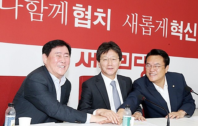 새누리당 정진석 원내대표(오른쪽)가 22일 오전 국회 원내대표실에서 열린 김해 신공항 관련 5개 시·도 중진의원 간담회에서 유승민(가운데)·최경환 의원과 함께 손을 모으고 있다.