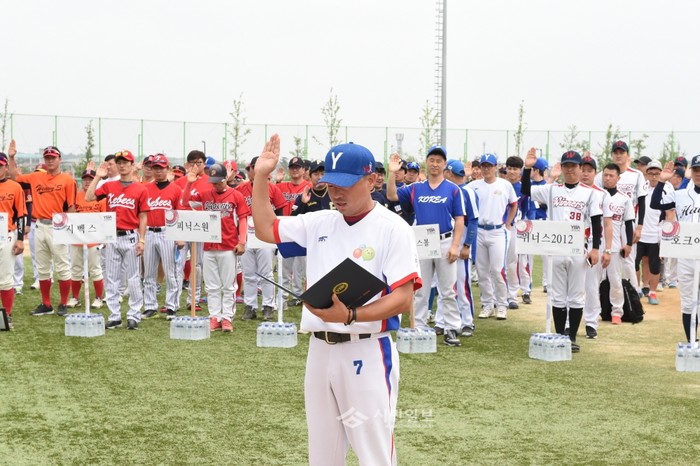 '제10회 양주시장기 야구대회'가 최근 경기 양주시 백석생활체육공원에서 개막됐다. 사진은 이번 대회에 참가한 선수들이 개막식에서 정정당당한 승부를 다짐하는 선서를 하는 모습.(사진제공=양주시청)