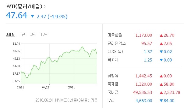 그런데 국민투표 결과 영국 EU탈퇴로 결정되면서 결국 회복됐던 가격이 47.64달러까지 내려간 것.