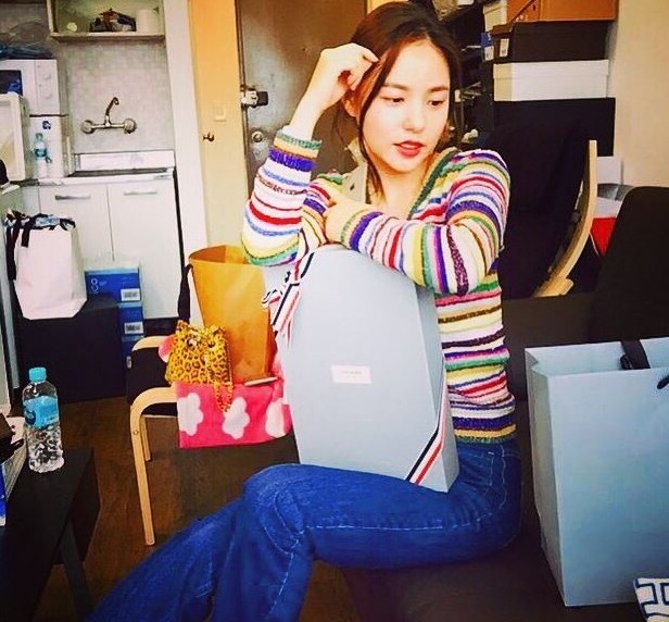 인스타 그램 속 민효린은 알록달록한 티셔츠에 데님팬츠를 입고 한 손으로 머리를 만지는 모습을 하며 바닥을 향해 시선 을 응시하고 있다.