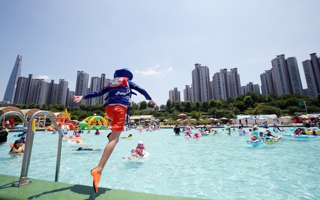 낮 최고기온이 25도에서 32도로 무더운 날씨를 보인 26일 서울 잠실 한강공원 수영장에서 한 어린이가 수영장 안으로 뛰어들고 있다.
