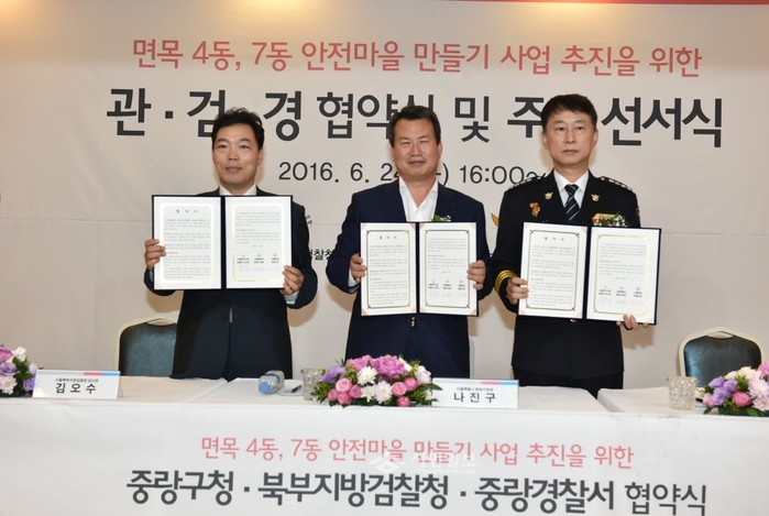 나진구 서울 중랑구청장(가운데)이 주민 200여명이 참여한 가운데 김오수 서울북부지방검찰청 검사장(왼쪽), 임병호 중랑경찰서장(오른쪽)과 면목4·7동 'ㅎㅎㅎ행복터' 안전한 마을 만들기 협약식을 열고 기념촬영을 하고 있다.(사진제공=중랑구청)