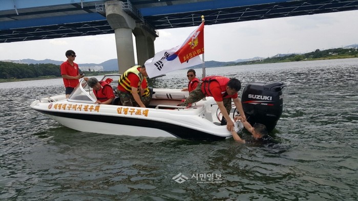 지난 25일 경북 구미시는 구미대교 둔치 체육공원에서 해병대 구미시 전우회 회원 및 관계자 200명이 참석한 가운데 2016년 수난구조활동 발대식을 개최했다. 사진은 행사에 참석한 관계자들이 구조 시연을 하는 모습.(사진제공=구미시청)