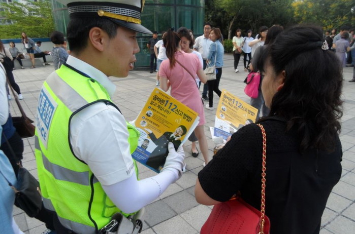 지난 25일 인천 삼산경찰서는 삼산월드체육관에서 열린 가수 이승철 콘서트 현장에서 법규준수 및 착한운전 캠페인을 대대적으로 진행했다. 사진은 경찰관이 콘서트 관람객들에게 홍보 전단을 배부하는 모습.(사진제공=인천 삼산경찰서)