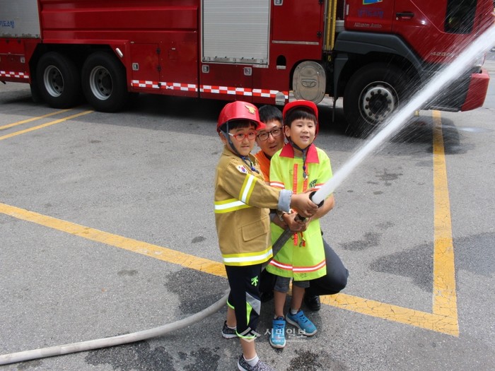 27일 경기 이천소방서는 지예슬유치원 원아를 대상으로 맞춤형 소방안전체험교실을 운영했다. 사진은 교육에 참석한 어린이들이 소방호스 사용 실습을 하는 모습.(사진제공=이천소방서)