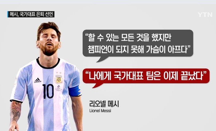 리오넬 메시(아르헨티나)가 대표팀 은퇴 선언을 해 전 세계 축구팬들에게 충격을 주고 있다.