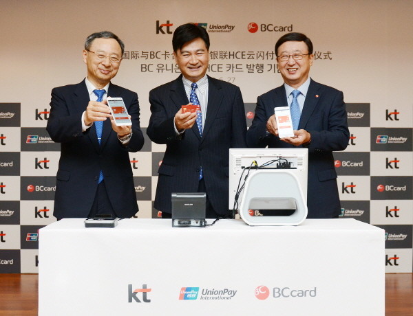 KT와 BC카드·유니온페이인터내셔널(UPI)은 27일 중국 상하이에 위치한 중국은련카드(차이나유니온페이, CUP) 본사에서 ‘모바일 퀵패스카드 출시 개통식’을 개최했다.
