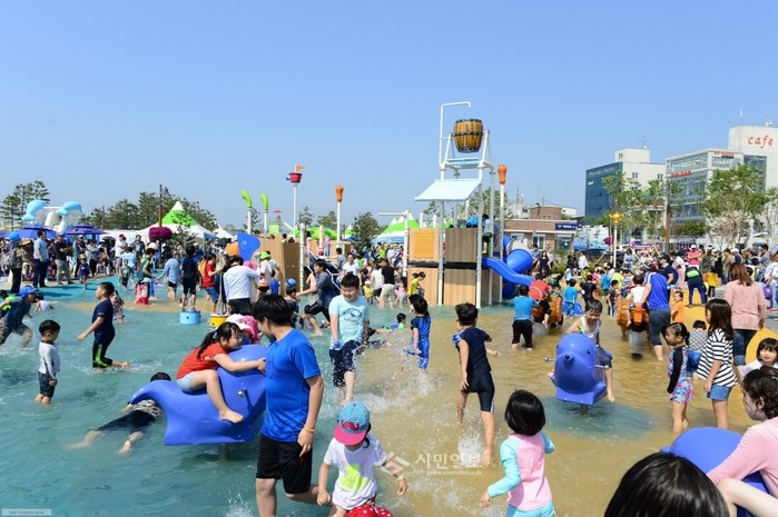 최근 경기 화성시 전곡항 총 538㎡의 공간에 범선 물놀이 조합시설, 슈팅헌터, 워터 터널 등의 물놀이 기구 등을 갖춘 코리요 물놀이장이 개장했다. 사진은 관광객들이 물놀이를 즐기고 있는 모습.(사진제공=화성시청)