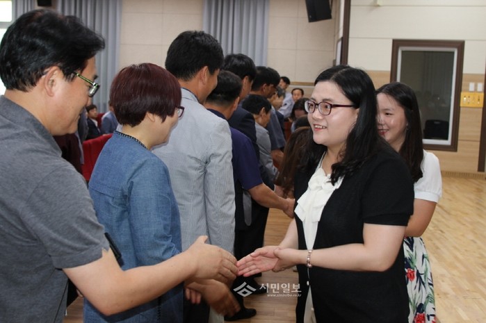 28일 오후 3시 충남 아산교육지원청은 특수교육지원센터 3층 대강당에서 오는 7월1일자 인사발령에 따른 지역내 전입 공무원 36명에 대한 사령장 교부식을 시행했다. 사진은 전입공무원들이 서로 악수하는 모습.(사진제공=아산교육지원청)