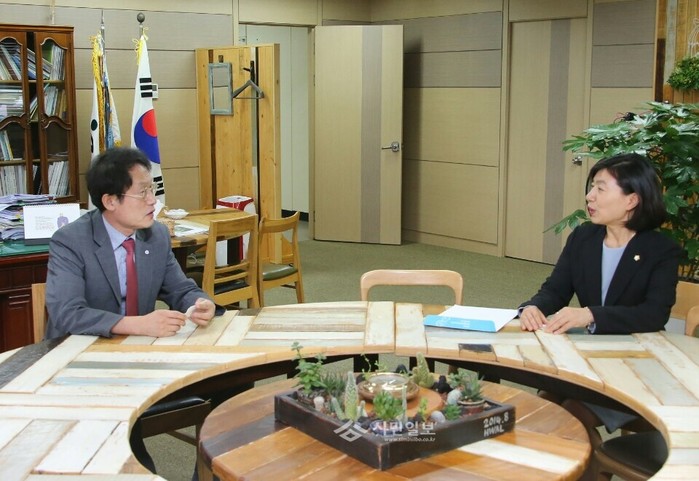 최근 서울시 교육청 조희연 교육감(왼쪽)을 방문한 김명옥 강남구의회 의장(오른쪽)이 세곡지역 중학교 신설 문제 등 강남구 교육분야 현안에 대해 논의하고 있다.(사진제공=강남구의회)