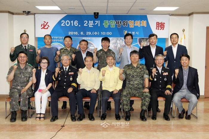 29일 경기 광명시의회 나상성 의장은 시청 중회의실에서 '2016년 2분기 통합방위협의회'를 진행했다. 사진은 나 의장(앞줄 오른쪽에서 네 번째)이 광명시 통합방위협의회 위원들과 기념촬영을 하는 모습.(사진제공=광명시의회)