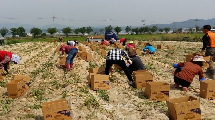 경기 여주시 농업기술센터에서 육성하고 있는 흥천면 농업인단체 중 농촌지도자회와 생활개선회는 최근 단체 공동밭에서 함께 감자 350여상자를 수확하고 그중 100여상자를 지역내 어려운 이웃에 전달했다. 사진은 관계자들이 감자를 캐는 모습.(사진제공=여주시청)