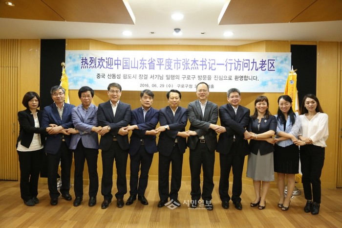 지난 29일 중국 산동성 평도시 정부대표단이 경제, 의료분야에 대한 상호 교류협력 방안을 논의하기 위해 자매결연을 맺은 서울 구로구를 방문했다. 사진은 이성 구청장(가운데)과 관계자들이 손을 맞잡고 기념촬영하는 모습.(사진제공=구로구청)