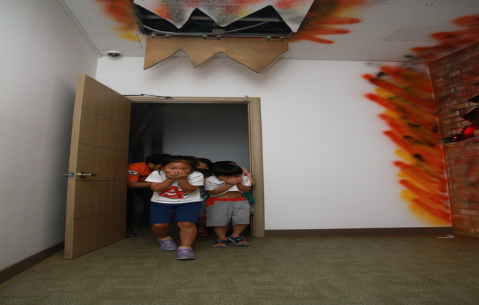 최근 은평소방서에서는 시민안전체험관을 방문한 지역내 은아새 어린이집 원생 및 지도교사 40여명에 대해 어린이의 눈높이에 맞춘 화재예방 안전체험 교육을 실시했다. 사진은 어린이들이 열·연기 피난체험을 하는 모습.(사진제공=은평소방서)