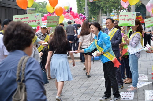최근 민선6기 취임 2주년을 맞은 김수영 서울 양천구청장(가운데)이 목동역에서 열린 이웃과 인사하기 캠페인에 참여해 출근길 주민들에게 인사를 하고 있다.(사진제공=양천구청)