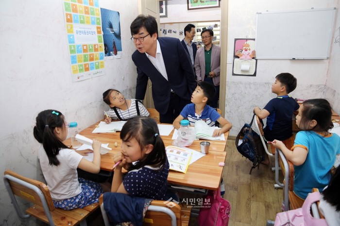 최근 김성 전남 장흥군수는 민선6기 취임 2주년을 맞아 장흥노인전문요양원, 건강가정·다문화가족지원센터, 늘푸른지역아동센터 등을 차례로 방문했다. 사진은 복지시설을 방문한 김 군수가 어린이들과 이야기를 나누는 모습.(사진제공=장흥군청
