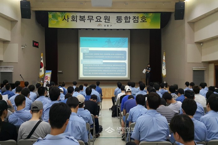 최근 서울 성동구는 구청 3층 대강당에서 본청, 동주민센터, 사회복지시설에 복무중인 사회복무요원 200여명을 대상으로 통합점호를 실시했다. 사진은 사회복무요원들이 특강을 받고 있는 모습.(사진제공=성동구청)