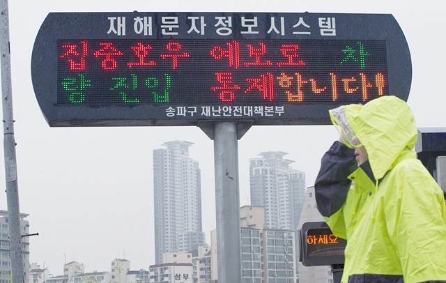 장마전선이 북상하면서 많은 비가 내릴 것으로 예고된 4일 오후 서울 송파구 탄천주차장 입구 전광판에 진입 통제 문구가 나오고 있다.