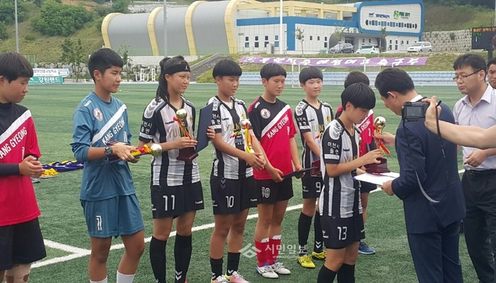 경기 이천시 소재 율면중학교 여자축구부가 최근 강원 강릉시 강남축구공원에서 열린 '2016 청학기 전국 여자 중·고 축구대회' 에 참가해 준우승을 차지했다. 사진은 시상식에서 축구부 선수들이 트로피를 받고 있는 모습.(사진제공=이천시청)