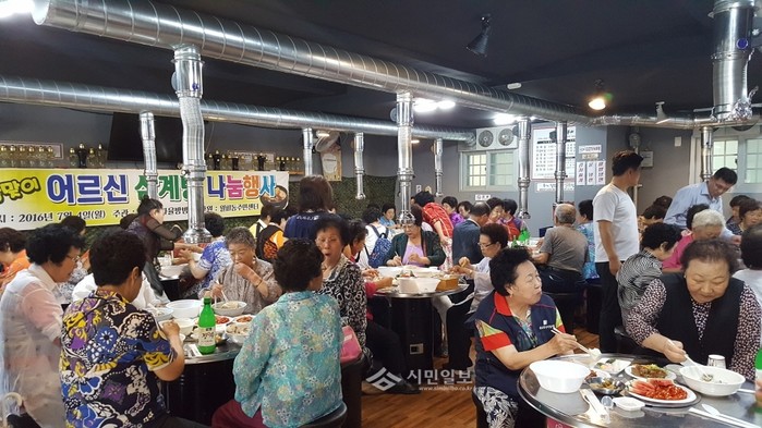 지난 4일 경기 안산시 월피동은 자율방범대 월피지대 주관으로 여름을 맞아 지역내 식당에서 성모·부르지 경로당 노인 100여명을 대상으로 삼계탕 나눔행사를 열었다. 사진은 노인들이 식사하고 있는 모습.(사진제공=안산시청)