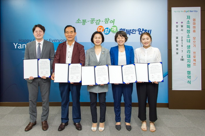 4일 오전 양천구청 열린참여실에서 개최된 '생리대 지원 나눔 협약식'에 참석한 김수영 양천구청장(가운데)이 협약체결 이후 관계자들과 함께 기념촬영을 하고 있다.(사진제공=양천구청)