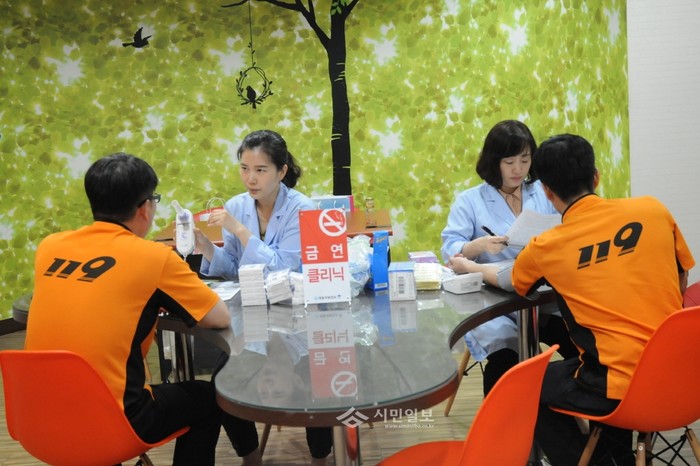 지난 5일 서울 마포소방서는 직장내 금연분위기 조성을 위해 마포보건소와 협의해 직원들을 대상으로 '출장 금연클리닉'을 운영했다. 사진은 소방관들이 금연상담을 받고 있는 모습.(사진제공=마포소방서)