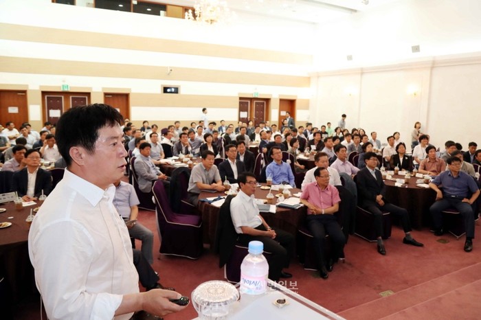 민선6기 2주년을 맞은 정찬민 경기 용인시장(왼쪽)이 최근 용인시청컨벤션홀에서 '민선6기 성과와 과제 시정운영 보고회'를 열고 참여자들에게 시정 운영성과와 과제에 대해 설명하고 있다.(사진제공=용인시청)