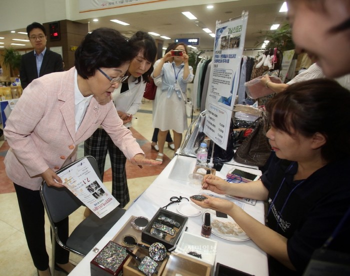 신연희 서울 강남구청장(왼쪽)이 최근 구청 로비에서 열린 ‘나누GO! 즐기JOB! 나눔 바자회'에서 참여자들이 판매하는 인테리어 소품을 둘러보고 있다.(사진제공=강남구청)
