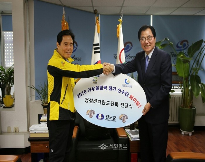 신우철 전남 완도군수는 최근 서울 노원구 태릉선수촌을 방문해 리우데자네이루 올림픽에 출전하는 국가대표 선수단에 시가 450만원 상당의 완도산 전복 90kg을 기증했다. 사진은 신 군수(오른쪽)와 최종삼 선수총장이 악수하며 기념촬영하는 모습.(사진제공=완도군청)
