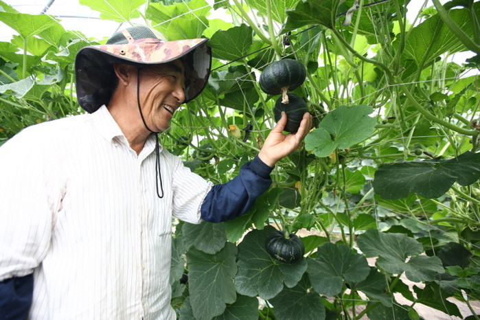 | ▲ 전남 해남군의 한 농가에서 농민이 밤호박을 수확하며 환하게 웃고 있다. | ||