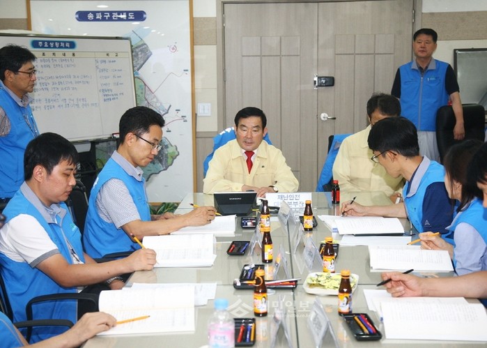임춘대 서울 송파구의장(가운데)이 최근 송파구청 5층에 설치된 '송파구 재난안전대책본부'를 방문해 관계자로부터 풍수해 대책조직 및 근무체계, 수방시설물 현황 및 주요 상황 처리 등에 대한 설명을 듣고 있다.(사진제공=송파구의회)