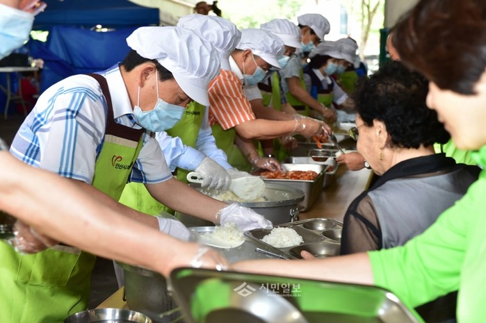 경기 안산시 간부공무원들은 지난 6일 지역내 상록수역 만남의 광장에서 노인들에게 점심식사 봉사활동을 펼쳤다. 사진은 이날 봉사에 참여한 제종길 시장(왼쪽)이 배식봉사를 펼치고 있는 모습.(사진제공=안산시청)