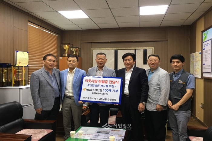 지난 6일 인천 서구 소재 이마트 검단점은 검단4동 주민센터에서 직원들이 자발적으로 기증한 헌혈증 100매를 검단탑병원에 기부하는 '이웃사랑 헌혈증' 전달식을 개최했다. 사진은 관계자들이 기념촬영하는 모습.(사진제공=인천 서구청)