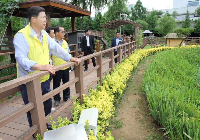 조길형 서울 영등포구청장(왼쪽)이 전국적으로 이어진 폭우가 소강상태를 보인 6일 양평유수지를 찾아 관계 공무원들과 현장점검을 진행하고 있다.(사진제공=영등포구청)