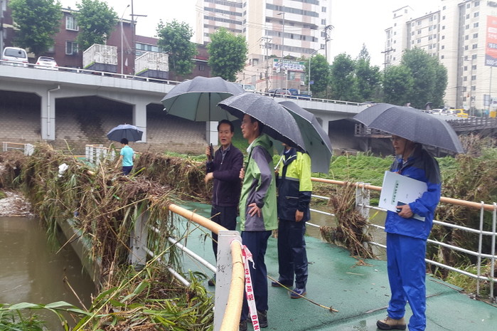 최근 신용목 은평부구청장은 집중 호우로 발생한 피해상황을 살피기 위해 불광전, 증산빗물펌프장과 갈현동 담장붕괴 현장 점검에 나섰다. 사진은 신 부구청장(가운데)이 불광천 하천 상황을 둘러보고 있는 모습(사진제공=은평구청)