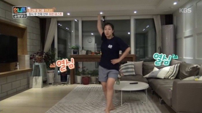 이날 라미란은 연습이지만 어느때보다 진지해 보이는 모습으로 청색티에 그레이컬러 반바지를 입고 열심이 안무연습을 했다.