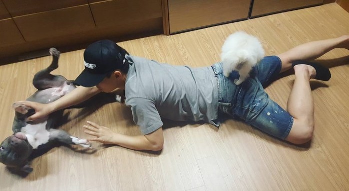 공개된 사진 속에는 양세형과 그가 키우는 강아지 두 마리가 함께 바닥에서 놀고있는 모습이 담겨있다.