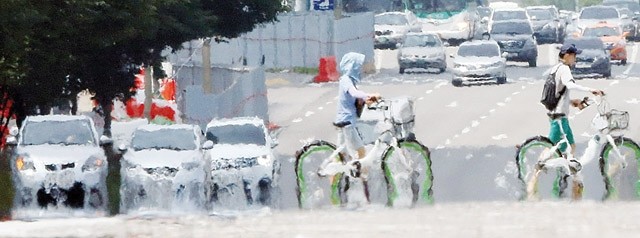 한낮 최고 기온이 35도까지 오르는 등 찜통더위가 계속된 10일 서울 여의도의 한 대로 위로 지열로 인한 아지랑이가 피어오르고 있다.