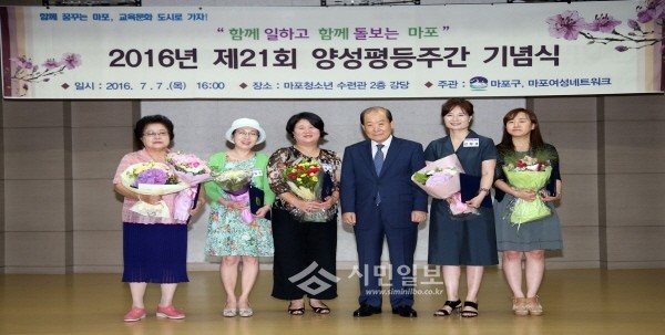 최근 서울 마포구는 마포청소년수련관 강당에서 '21회 양성평등주간 기념식' 행사를 열었다. 사진은 박홍섭 구청장(오른쪽에서 세번째)이 양성평등 유공자들에게 표창을 수여한 후 기념촬영하는 모습.(사진제공=마포구청)