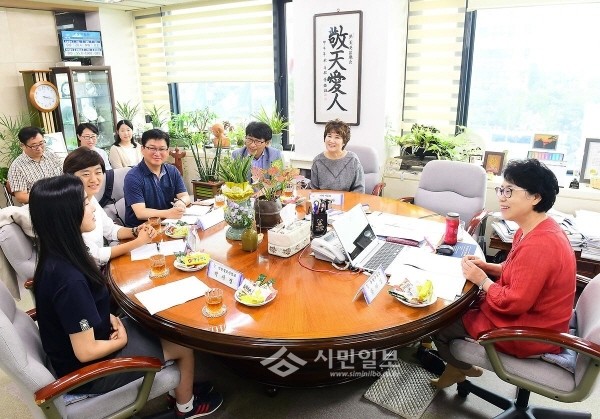 홍미영 인천 부평구청장(오른쪽)이 최근 집무실에서 주민과의 대화를 진행하며 참여 학생과 이야기를 나누고 있다.(사진제공=부평구청)