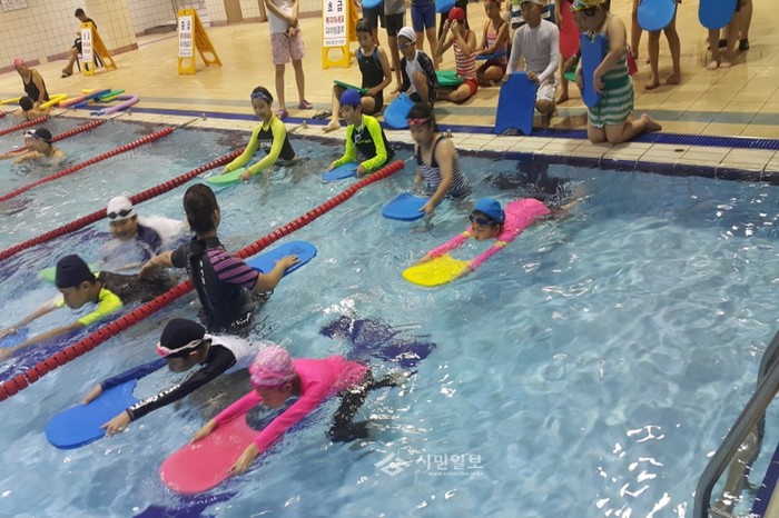 최근 경기 연천시에 위치한 백학초등학교는 3~6학년 학생을 대상으로 연천 청소년수련관 수영장에서 자기 생명 보호능력과 물에 대한 적응력을 향상시키기 위한 '생존수영교육'을 실시했다. 사진은 학생들이 수영교육을 받는 모습.(사진제공=백학초등학교)