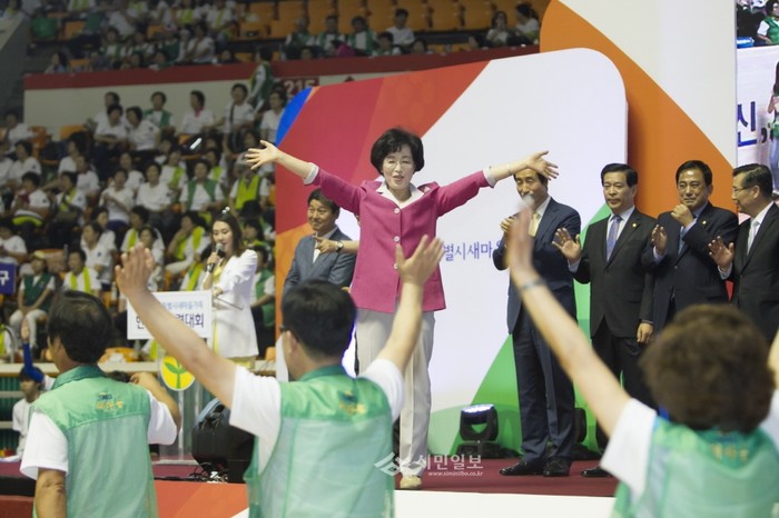 최근 박춘희 서울 송파구청장은 잠실종합운동장에서 서울시 새마을회가 주최하고 새마을운동 송파구지회가 추진해 열린 '제1회 서울시 새마을가족 한마음 수련대회'에 참석했다. 사진은 박 구청장이 참가자들을 환영하고 있는 모습.(사진제공=송파구청)