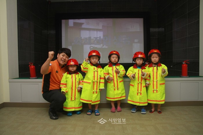 11일 서울 은평소방서에서는 시민안전체험관을 방문한 지역내 새별밭 어린이집 원생 및 지도교사 40여명에 대해 어린이의 눈높이에 맞춘 안전체험 교육을 실시했다. 사진은 소방관이 어린이들과 기념촬영을 하는 모습.(사진제공=은평소방서)
