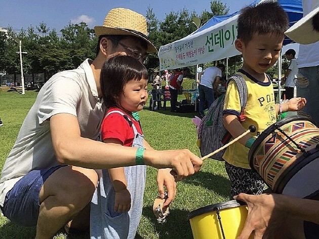 최근 강동구 일자산 공원에서 비누방울 만들기, 젠가 쌓기, 난타놀이, 볼보볼 등 다양한 체험이 가능한 가족건강놀이터 ‘선데이파크’가 열렸다. 사진은 ‘선데이파크’를 방문한 한 아이들이 부모와 함께 북을치며 놀고 있는 모습.(사진제공=강동구청)