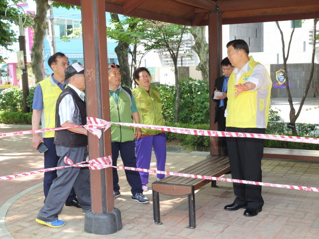 조길형 서울 영등포구청장이 최근 찾아가는 현장 행정의 일환으로 대림동에 위치한 원지공원을 방문해 공원내 정자 등 시설에 대한 안전점검을 진행하고 있다.(사진제공=영등포구청)