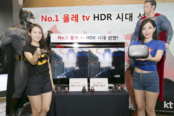 KT는 이번 간담회에서 HDR을 지원할 수 있는 셋톱박스를 개발∙적용했다고 밝혔다. 또한 워너브라더스와 영화 <배트맨 대 슈퍼맨: 저스티스의 시작>, <매드맥스: 분노의 질주> 2편의 HDR 전용 콘텐츠를 선보인다고 설명했다. KT는 연말까지 워너브라더스 등 다양한 콘텐츠 공급자와 협력해 65편의 HDR 콘텐츠를 IPTV 서비스로 제공할 계획이다.