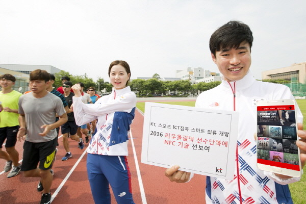 KT는 노스페이스(영원아웃도어)와 함께 근거리 무선통신 기반의 NFC 기술을 접목한 운동복을 개발해 2016 리우 올림픽 대회에 출전하는 대한민국 국가대표 선수단 ‘팀코리아(Team Korea)’ 선수단복에 적용한다고 12일 밝혔다.